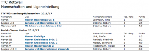 25.9.16 Herren 1 vorübergehend Tabellenführer Bezirksliga Alb/Oberer Neckar Herren TTC Sulgen – TTC Rottweil 5:9 Am Sonntagmorgen waren die Rottweiler im Schramberger Teilort Sulgen zu Gast. Hier wollten die Akteure um Kapitän Timo Lehmann nach knapp gewonnenem Auftaktspiel nachlegen. Wollten die Rottweiler nicht frühzeitig in den Abstiegskampf geraten, war ein Sieg beim Aufsteiger fast Pflicht. …