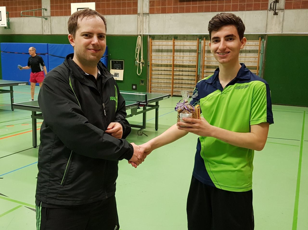Vereinsmeister unter sich: Besart Mulaku wird vom 2. Vorstand Stefan Reichelt beglückwünscht.